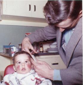 Quarters O-36, US Naval Station, Adak. Rita as Fidel Castro at an O-Club party. Donnie at 5 and 9 months. Don as Executive Officer of the USCGC CLOVER. Don cutting hair (everyone cheered when he retired as barber!). Incredible Alaskan salmon fishing.
