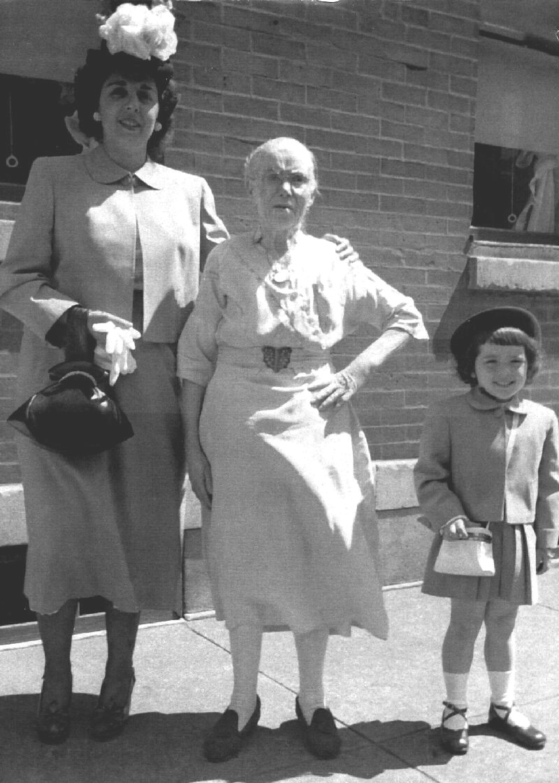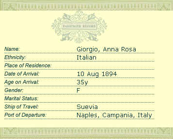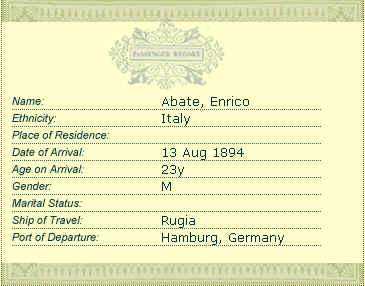 (Click to enlarge) 1. Rita's Grandmother, Rose Abate(age 78), with her granddaughter Norma Ermilio (Abate) and Greatgranddaughter Joyce in 1947. Grandma Abate threads a needle on her 100th birthday. She was a very classy, proper lady. She only spoke Italian. 2. Rose (nee Anna Rosa Giorgio) and her Husband, Enrico , came over from Italy in 1894. He was a stowaway on his ship, not an uncommon practice in those days, since many immigrants had little money. We believe that these are their immigration records from Ellis Island. |